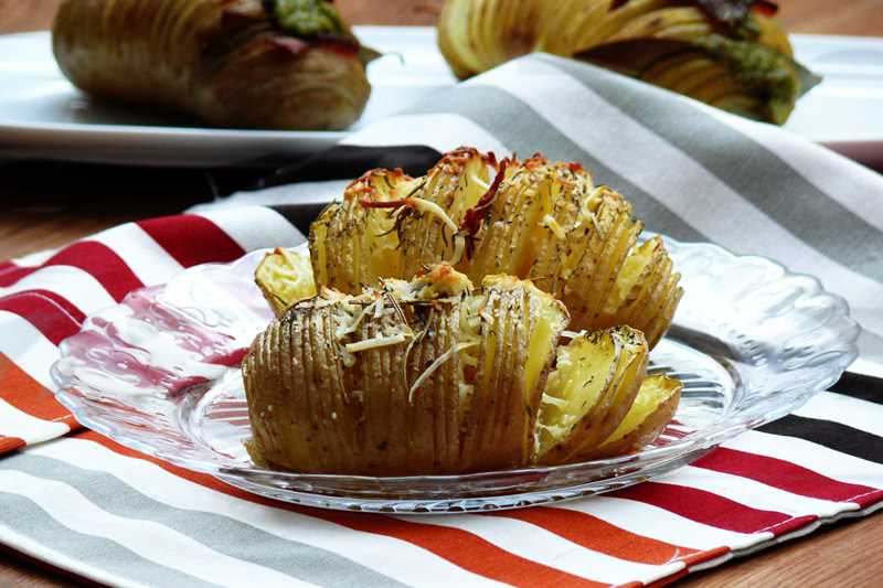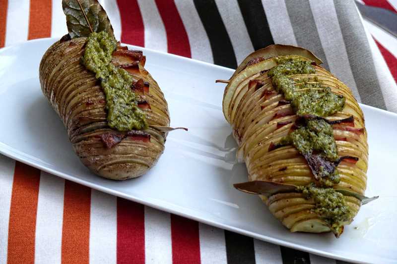 Son muchas las variantes de esta receta de patatas que circulan por internet y blogs de recetas. Hoy hemos preparado dos tipos de patatas al horno hasselback, unas más clásicas con queso y hierbas aromáticas y otras algo más atrevidas, con salsa pesto y bacon…