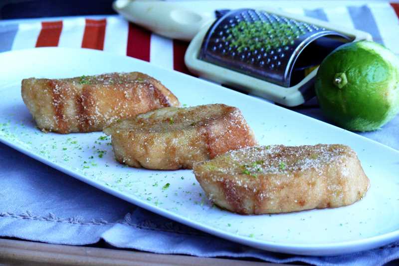 En este punto ya tenemos nuestras torrijas con leche de coco jengibre y lima listas, si nos venimos arriba, nos quedan ganas y sobra tiempo, podemos preparar un galseado de lima para decorar y acompañar a nuestra rebanadita de pan.