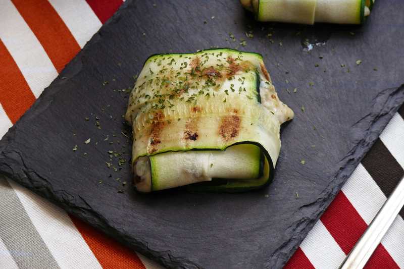 Para montar los raviolis, será suficiente con hacer una ‘cruz’ con dos tiras de calabacin, colocar nuestro relleno en medio y cerrar las 4 partes de las tiras, ¿fácil verdad?