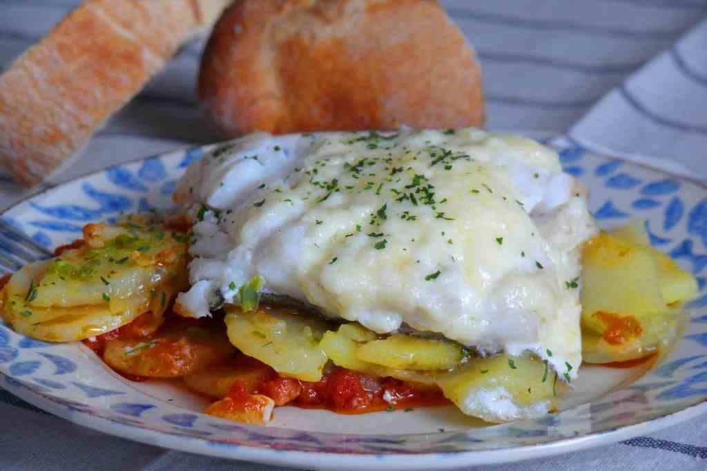 Con una cama de tomate y patatas panadera, un poco de alioli o mahonesa si nos gusta más suave, este plato de bacalao es un acierto seguro si tenemos familia a comer. Los más pequeños lo deboran.